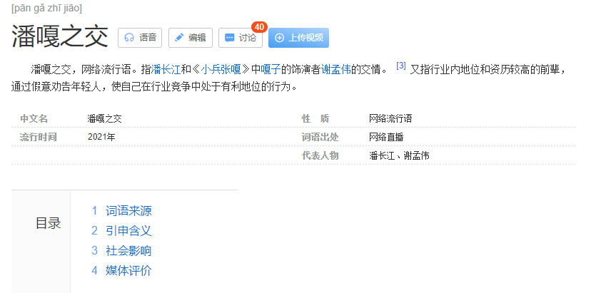 “潘嘎之交”甚至被写进百度百科词条,以此来形容比喻言行不一致,说话不负责任或与之前自己所言背道而驰所表现出来的一种不诚信、不明智的行为或形象。