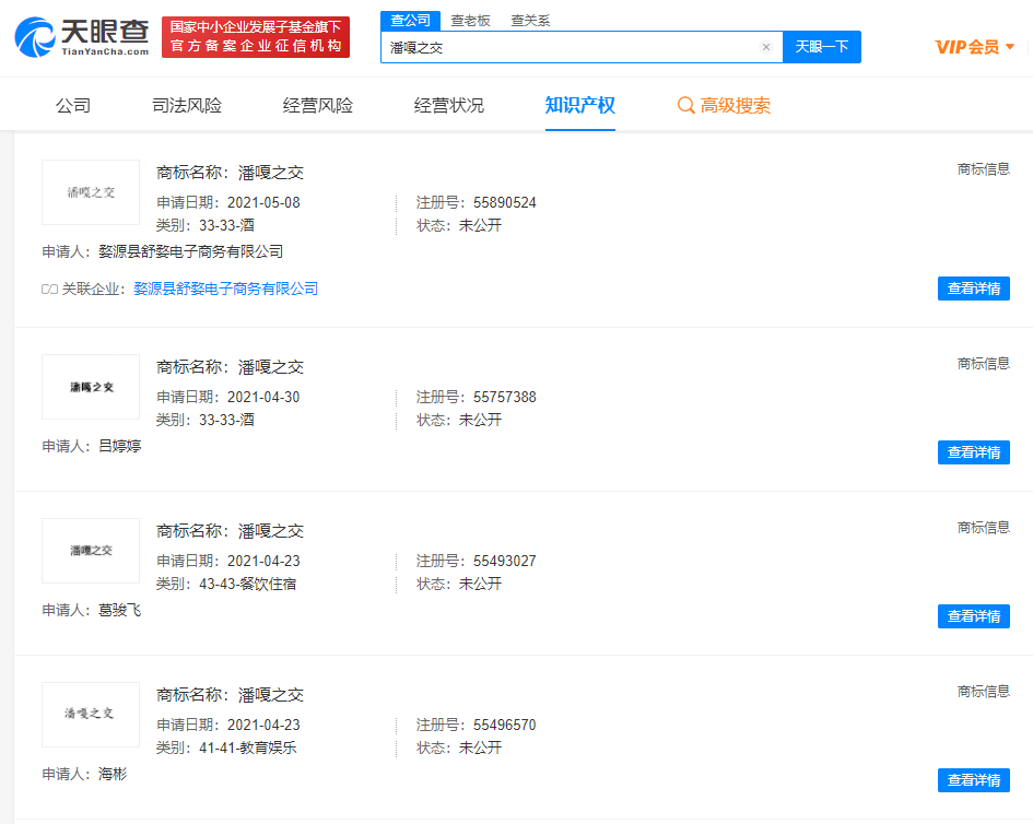 根据天眼查App显示,近日“潘嘎之交”相关商标陆续被多家公司申请注册,申请人包括河南华粮农业发展有限公司、北碚区安余沫文化传媒工作室等,国际分类涉及酒、广告销售等,商标状态均为“商标申请中”。