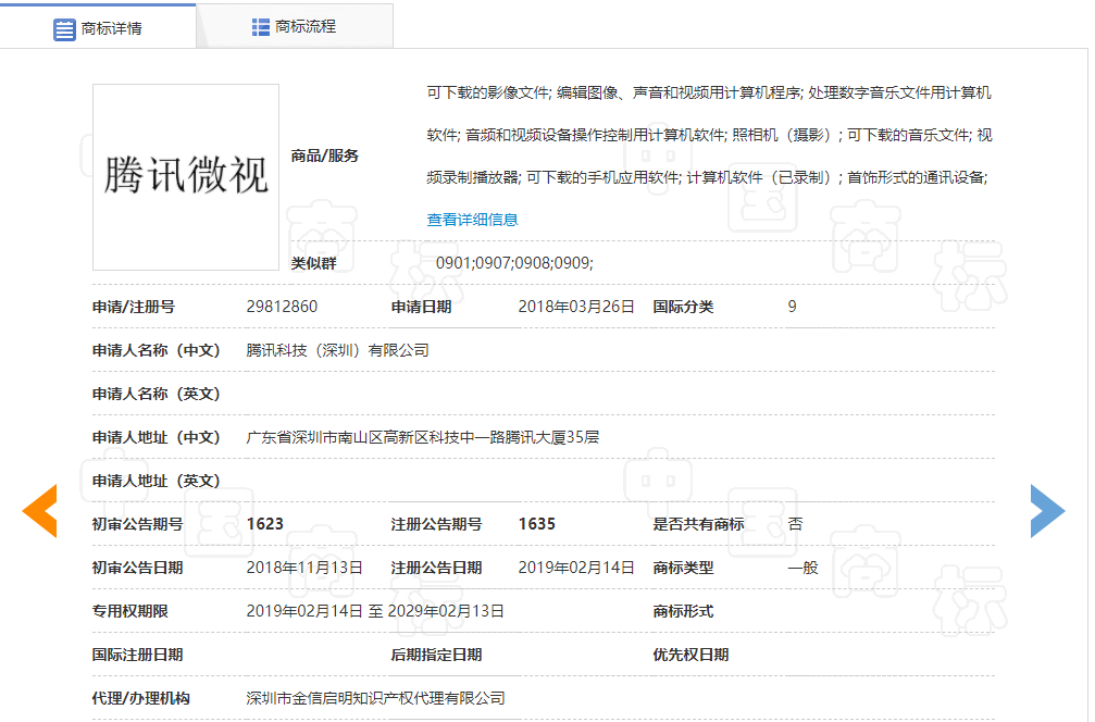 据查询,腾讯公司于2018年曾申请了“腾讯微视”、“腾讯微视相机”、“腾讯微视智能眼镜”等商标,注册在第9类-科学仪器这一核心类别。这几件商标于2019年初被核准注册,专用期限到2029年。