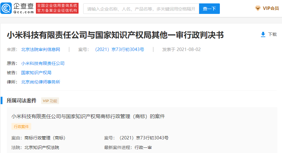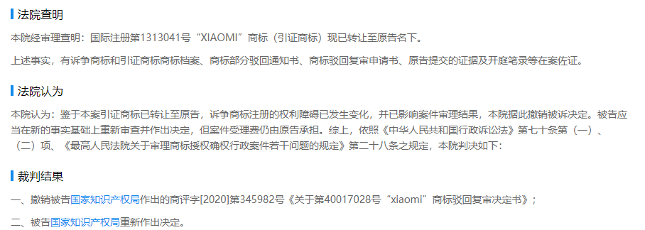 根据企查查APP显示,近日,小米科技有限责任公司与国家知识产权局其他一审行政判决书公开,法院查明诉争商标为“xiaomi”,且引证商标“XIAOMI”已转让至原告小米公司旗下。判决结果显示,撤销“xiaomi”商标驳回复审决定书,重新做出决定。