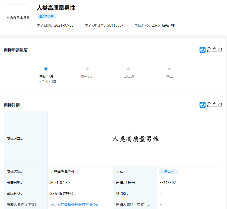 根据8月10日消息,天眼查App显示,河北盈汇数据处理服务有限公司日前申请注册两个“人类高质量男性”商标,国际分类为广告销售、服装鞋帽,状态显示正在申请中。